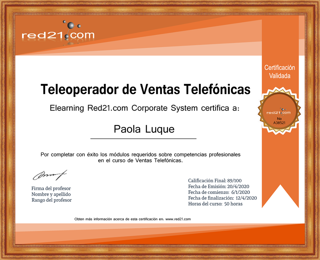 Al presentar, y aprobar la prueba final, recibirás un certificado de Aprobación del curso emitido por la Distance Learning Red21.com Corporate System reconocido por las principales empresas bajo la modalidad de enseñanza privada. A continuación un ejemplo de un certificado.