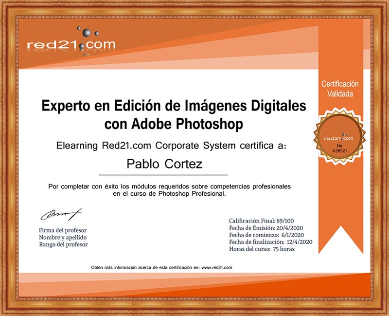 Al presentar, y aprobar la prueba final, recibirás un certificado de Aprobación del curso emitido por la Distance Learning Red21.com Corporate System reconocido por las principales empresas bajo la modalidad de enseñanza privada. A continuación un ejemplo de un certificado.
