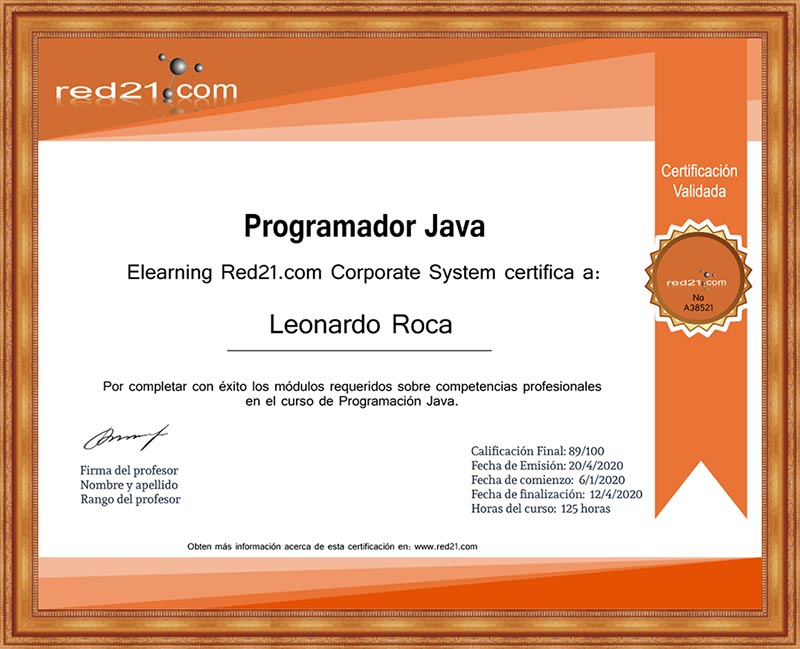 Al presentar, y aprobar la prueba final, recibirás un certificado de Aprobación del curso emitido por la Distance Learning Red21.com Corporate System reconocido por las principales empresas bajo la modalidad de enseñanza privada. A continuación un ejemplo de un certificado.