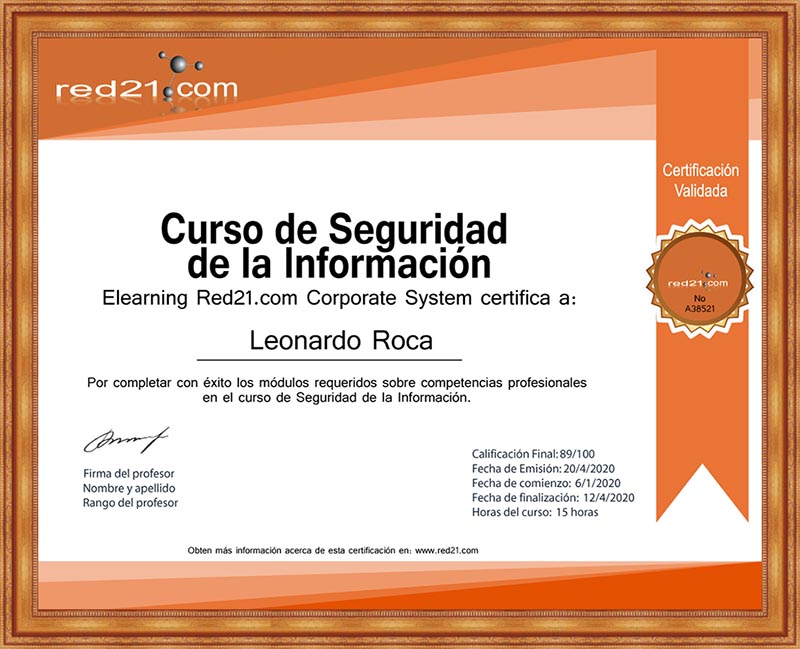 Al presentar, y aprobar la prueba final, recibirás un certificado de Aprobación del curso emitido por la Distance Learning Red21.com Corporate System reconocido por las principales empresas bajo la modalidad de enseñanza privada. A continuación un ejemplo de un certificado.
