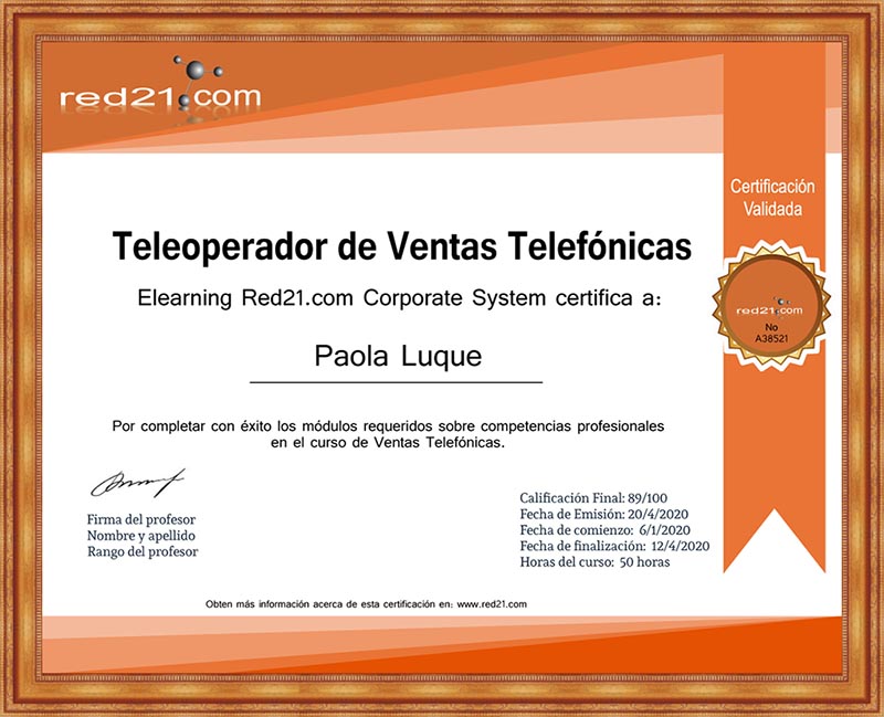 Al presentar, y aprobar la prueba final, recibirás un certificado de Aprobación del curso emitido por la Distance Learning Red21.com Corporate System reconocido por las principales empresas bajo la modalidad de enseñanza privada. A continuación un ejemplo de un certificado.